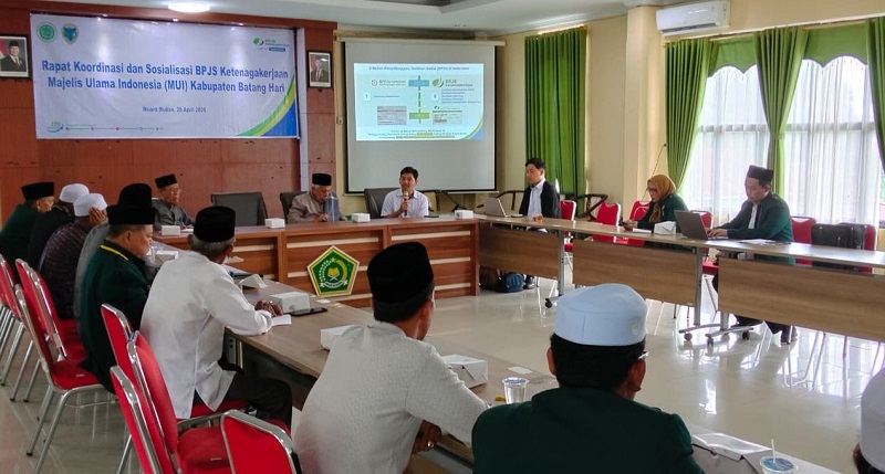BPJS Ketenagakerjaan Batang Hari menggelar kegiatan rapat koordinasi dan sosialisasi, di Aula Kantor Kementerian Haji dan Umrah Kabupaten Batang Hari, Senin | dok bpjstk
