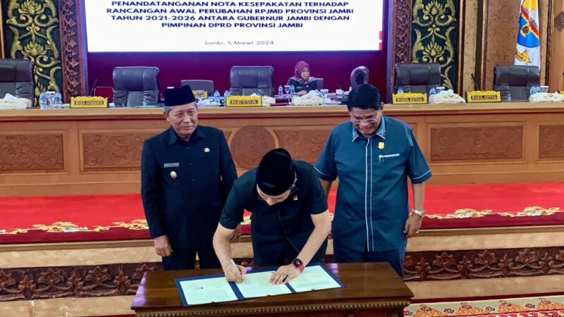 Atas kesepakatan itu, dilakukan penandatanganan persetujuan bersama, antara Pemprov dan DPRD Provinsi Jambi, serta penyampaian rancangan awal RPJMD Provinsi Jambi 2021 – 2026 oleh Abdullah Sani.