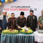 Asisten Pemerintahan dan Kesra Setda Kabupaten Tanjabbar, Mulyadi, memotong tumpeng pada peringatan Hari Bakti Imigrasi ke…