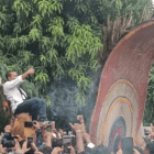Romi Hariyanto diarak dengan Reog Ponorogo, saat tiba di kantor KPU Provinsi Jambi, Kamis (29/8/2024) |…